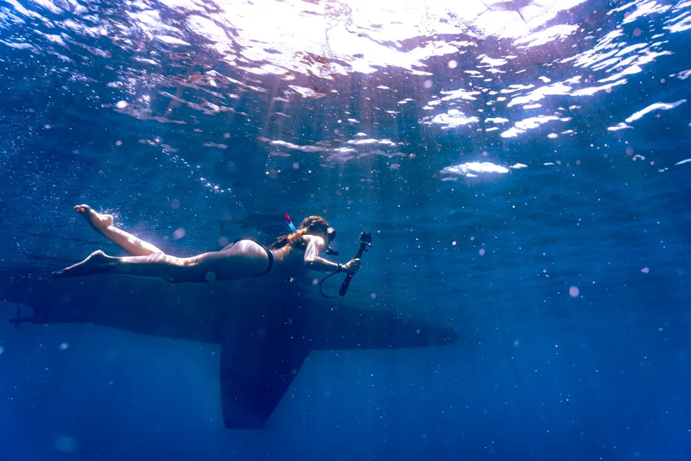 “Look over there! A breath!” That’s the signal. The deck is abuzz with excitement. Some pointed to the north-west, while Gilles, a captain well versed in such missions, luffed up and kept his cool. Then nothing, just silent waiting. The beast’s breath has disappeared, but the fever is still there, making our eyes squint into the sun-dappled distance. Then suddenly a breath, then a second, and then another, sprays of water betraying their glittering dust above the azure immensity. With each new plume, we correct our course, gradually approaching the mammals, which we can only guess are huge. Maude and Aurélie’s excitement is palpable. The two eco-volunteers have signed up for the week with the Swiss Cetacean Society (SCS), keen to advance the science and protection of marine mammals. Charlotte and Jodie, the two passionate volunteer guides, scan the scene through their lenses, spotting two 20-metre rorquals. A common dolphin appears in front of the bow, showing off its yellow plastron as it twirls under the bow. Other stenellae coeruleoalbae – or blue-and-white dolphins – dart gently around two huge foaming footprints: where, with a final stroke of their flukes after filling their lungs with oxygen, the whales have just sounded and disappeared into the depths. Barely holding back her emotion, Charlotte explains: “It’s just incredible. The common dolphin has long been threatened with extinction. And here we have an individual in the presence of two fin whales. It’s just crazy!”